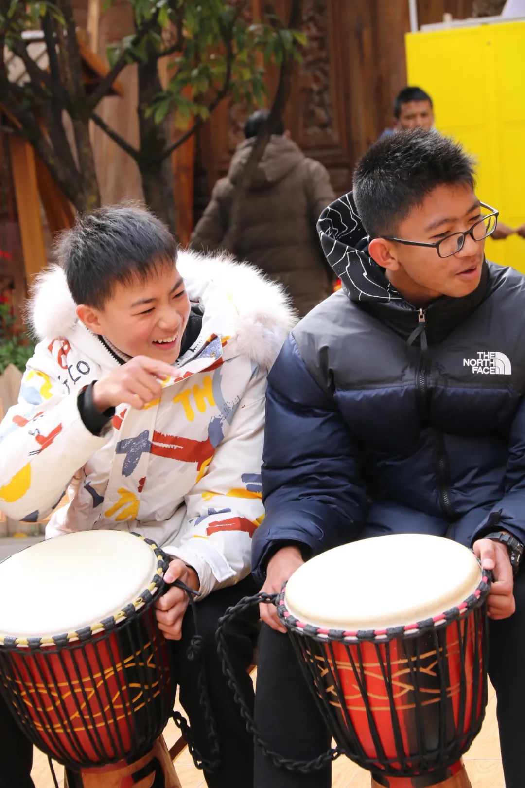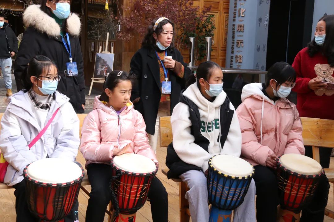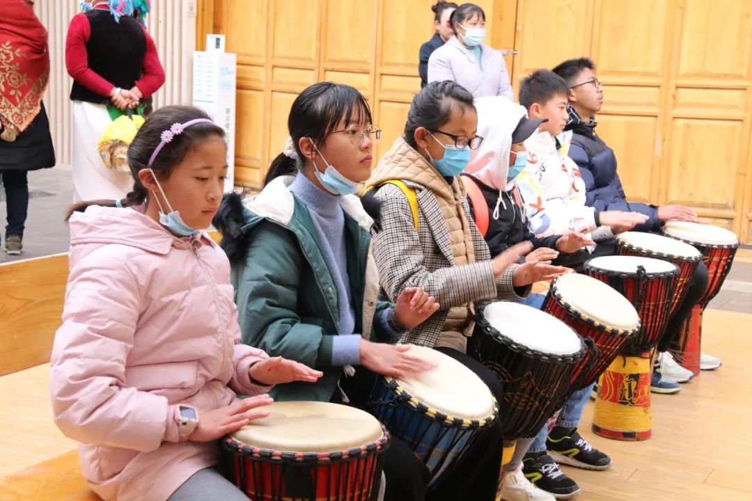 民谣广场的手鼓学习体验活动尤其受到大家喜欢。孩子们认真听老师讲解,在掌握了打鼓的基本技巧之后,跟着音乐敲响欢乐的节奏、享受音乐带来的快乐。