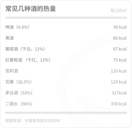 我想大多数人都不知道酒精本身有热量,比碳水化合物还高很多:酒精的能量系数是7kcal/g,碳水化合物是4kcal/g。高度数酒的热量比米饭还高,比如二锅头(58度)的热量有351kcal/100ml。