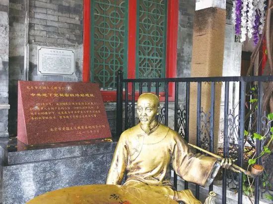 院门口矗立着一块大理石石碑,上面镌刻着“北京市文物保护单位——纪晓岚故居”字样。石碑右侧有一个青铜色老者雕像,翘腿端坐但神情肃穆,手持一杆大烟袋,不用多问那便是纪晓岚。在其右后方,一块红底黄字的石碑格外引人注目,写有“北京市爱国主义教育纪念地——中共地下党秘密联络站遗址”字样。纪晓岚故居是如何成为中共地下党秘密联络站的?