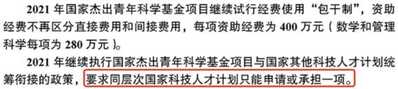 2021年继续执行国家杰出青年科学基金项目与国家其他科技人才计划统筹衔接的政策,要求同层次国家科技人才计划只能申请或者承担一项。