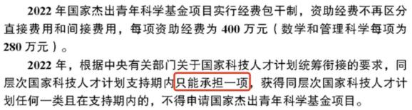 2022年,根据中央有关部门关于国家科技人才计划统筹衔接的要求,同层次国家科技人才计划支持期内只能承担一项,获得同层次国家科技人才计划任何一类且在支持期内的,不得申请国家杰出青年科学基金项目。