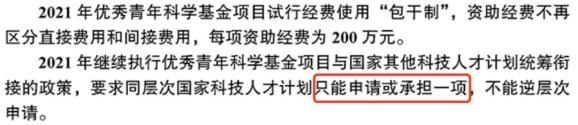 2021年继续执行优秀青年科学基金项目与国家其他科技人才计划统筹衔接的政策,要求同层次国家科技人才计划只能申请或者承担一项,不能逆层次申请。