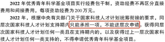 2022 年,根据中央有关部门关于国家科技人才计划统筹衔接的要求,同层次国家科技人才计划支持期内只能承担一项,不能逆层次申请。获得同层次国家科技人才计划任何一类且在支持期内的,以及获得过上一层次国家科技人才计划任何一类支持的,不得申请优秀青年科学基金项目。