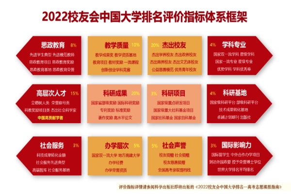 艾瑞深校友会网中国大学排名是中国最具影响力、权威性和公信力的大学排名领先品牌,至今已连续20年发布校友会中国大学排名、中国一流学科排名、中国一流专业排名和中国大学教学质量排名等榜单。2022校友会中国大学排名评价指标体系由思政教育、杰出校友、教学质量、高层次人才、优势学科专业、科研成果、科研基地、科研项目、社会服务、办学层次、社会声誉、国际影响力等12大一级指标构成,以服务国家“双一流”发展战略和提升高校服务国家地方经济社会发展能力为导向,涵盖了中国高校核心职能的700多项评测指标。
