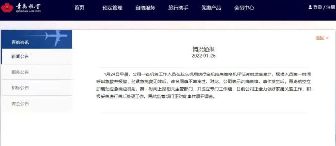 26日,青岛航空官网通报,山东青岛胶东机场内24日发生一起事故,一架由青岛航空管理并使用的空中客车A320飞机在机场内拖移时,将一名随同飞机移动的机务工作人员碾压致死。对此,青岛航空表示沉痛哀悼,事件发生后立即启动应急响应机制,并成立专门工作组。目前公司正全力做好家属关爱工作,积极妥善进行善后处理工作,民航监管部门正对此事件展开调查。(中国新闻网)