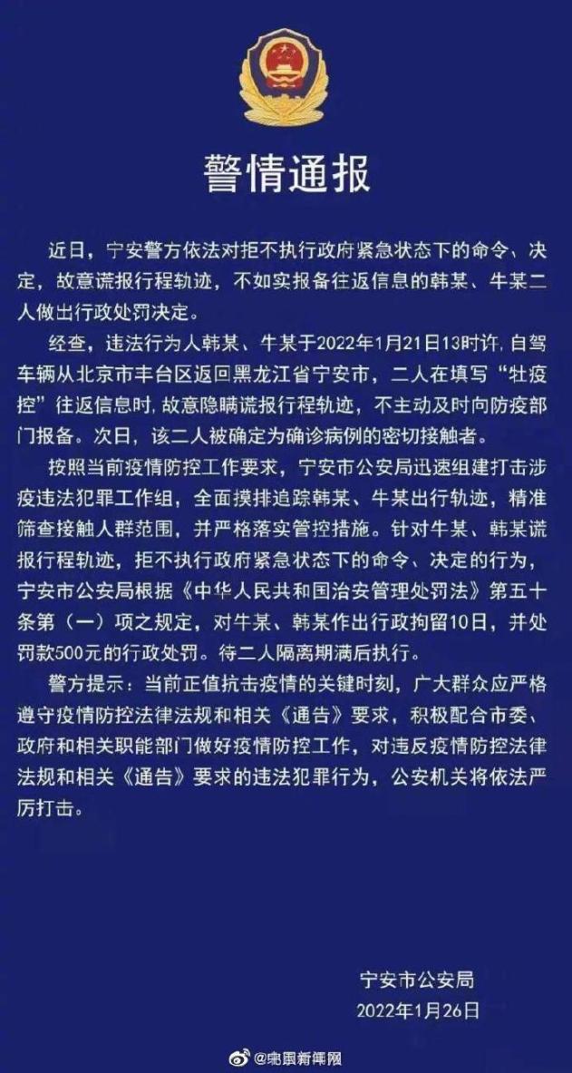 4.两密接者从北京返回黑龙江隐瞒行程被拘:黑龙江省牡丹江市宁安市公安局26日发布通报,违法行为人韩某、牛某于1月21日自驾车辆从北京市丰台区返回宁安市,二人在填写“牡疫控”往返信息时,故意隐瞒谎报行程轨迹,不主动及时向防疫部门报备。次日,二人被确定为确诊病例的密切接触者。针对牛某、韩某谎报行程轨迹的行为,警方对二人作出行政拘留10日并处罚款500元的行政处罚。(中国新闻网)