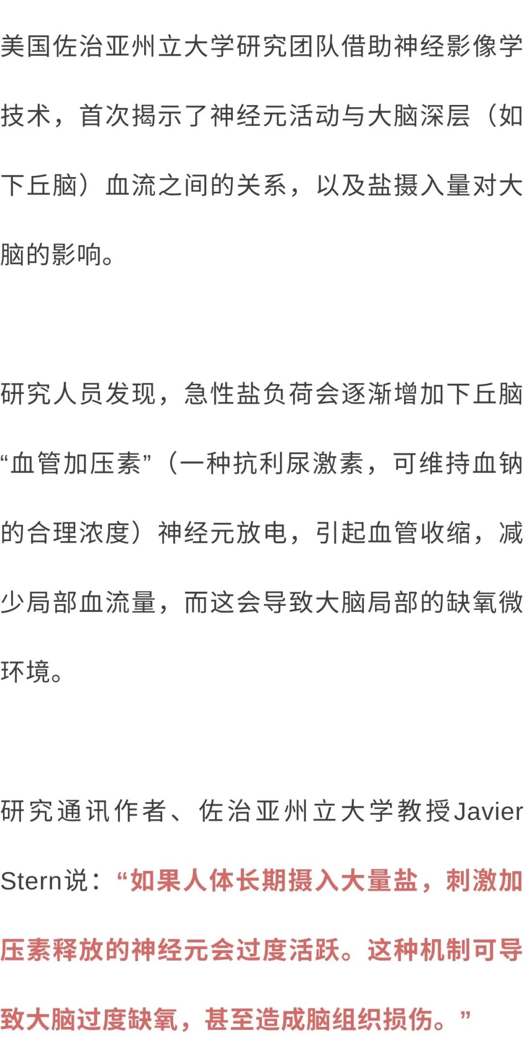 盐是百味之首,是家家户户厨房里必备的调味品,没有盐做出来的菜缺少灵魂。但当一个人盐摄入量过高时,身体会发生什么?近日,发表在权威医学杂志《细胞报告》上的一项研究发现:高盐饮食会导致大脑深层区域血流量减少,引发局部缺氧微环境,导致大脑过度缺氧,甚至造成脑组织损伤。吃盐多了真的会让大脑缺氧吗?还对身体有哪些伤害?我们又应该如何减盐限盐呢?小北这就带你去了解一下!