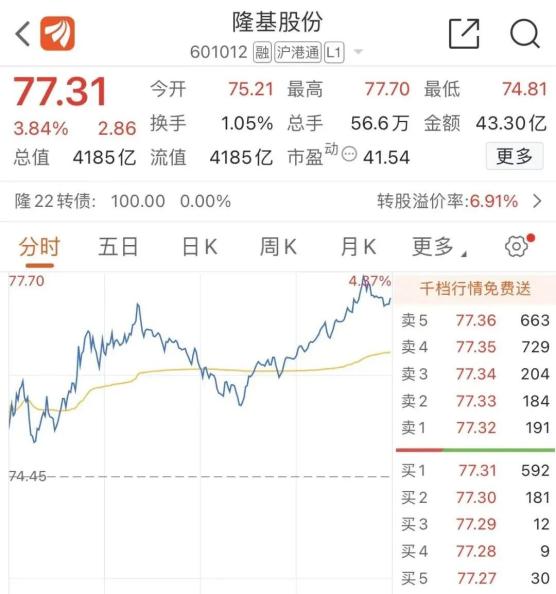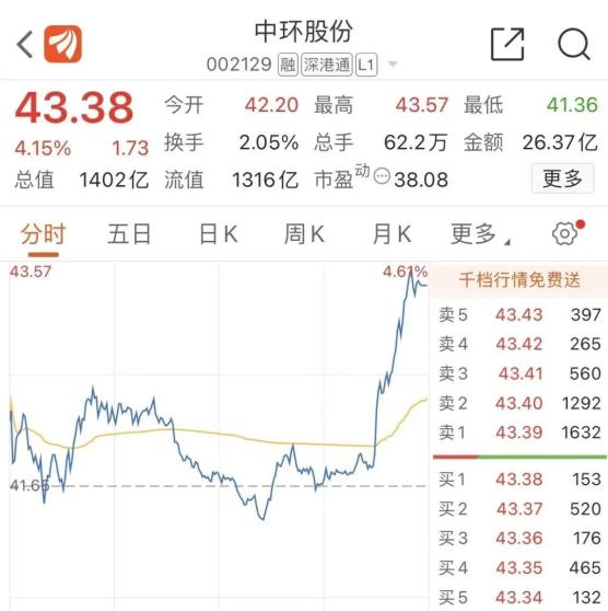 受涨价消息影响,中环股份股价尾盘大幅拉升,盘中一度涨近5%,最终收涨4.15%,最新市值为1402亿元;隆基股份股价也震荡攀升,收涨3.84%,最新市值为4185亿元。