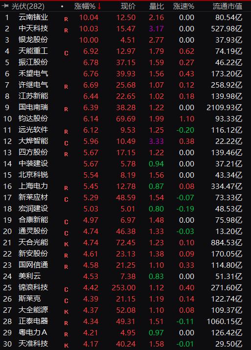 而且,整个光伏板块也全线大涨,云南褚业、中天科技、银隆股份涨停,天能重工、振江股份、禾望电气、许继电气、江苏新能、国电南瑞、钧达股份等涨幅超6%,大烨智能、中装建设、北京科锐、上海电力、新莱应材等涨逾5%。