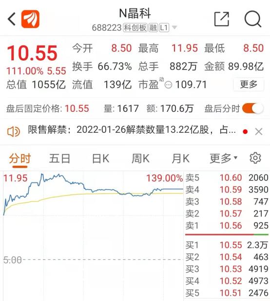 26日,太阳能光伏组件龙头晶科能源上市大涨,也提升了市场对光伏板块的信心。晶科能源盘中一度因涨幅过大而触发临停,最终收涨111%,股价报10.55元/股,总市值达到1055亿元。