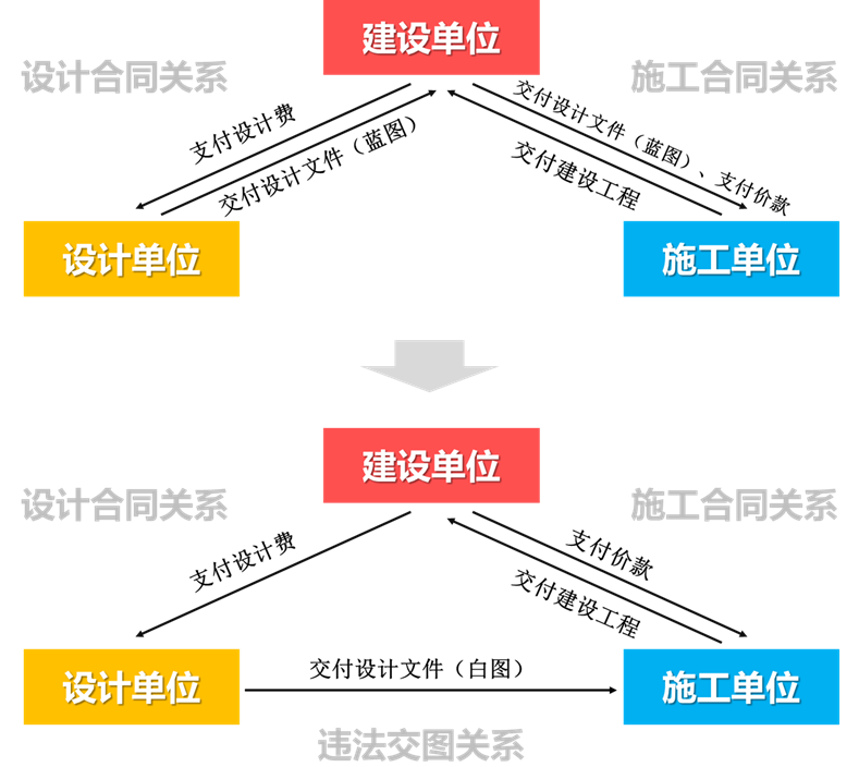 图1 建设单位、设计单位、施工单位法律关系转变示意图