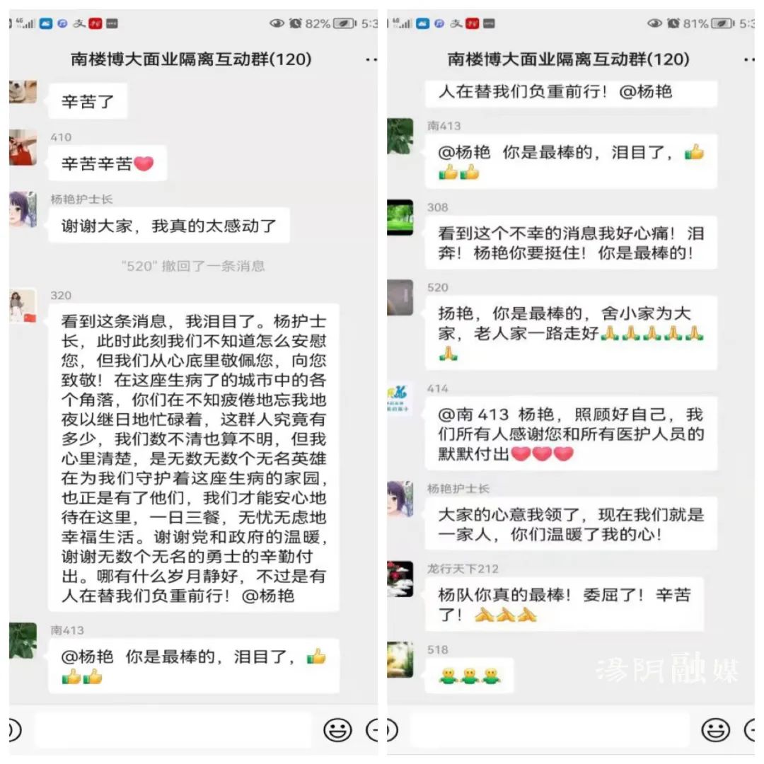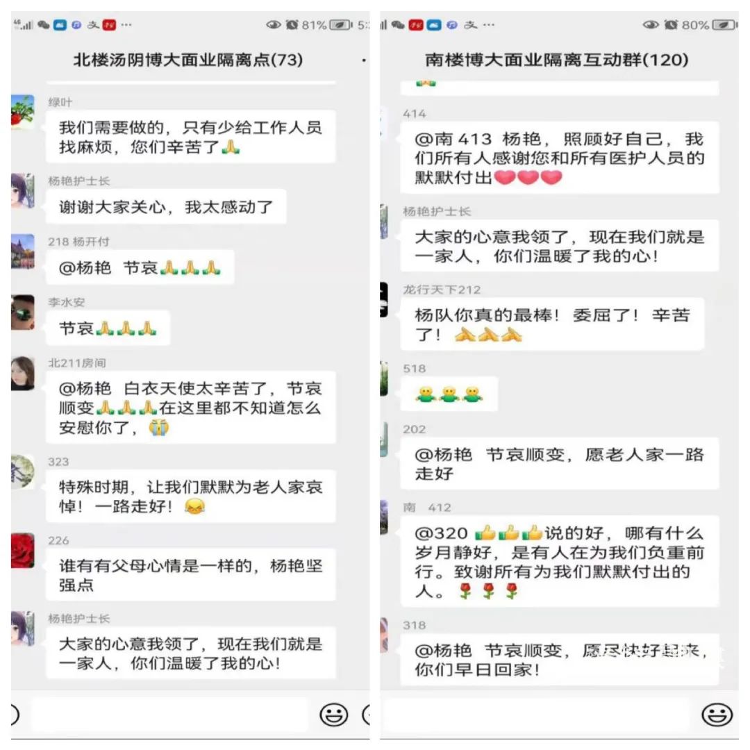 隔离群众知道杨艳父亲去世,她仍坚守一线的消息后,纷纷通过微信前来安慰: