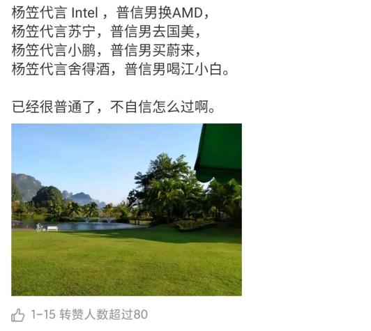 但是这依然不妨碍观众对她进行指责、对品牌方进行抵制。而且,这不是杨笠第一次在商业活动中被网友抵制了。去年3月18日,英特尔发布了一条杨笠的代言广告,杨笠在广告中以脱口秀表演的风格说出广告语:“英特尔的眼光太高了,比我挑对象的眼光都高。”