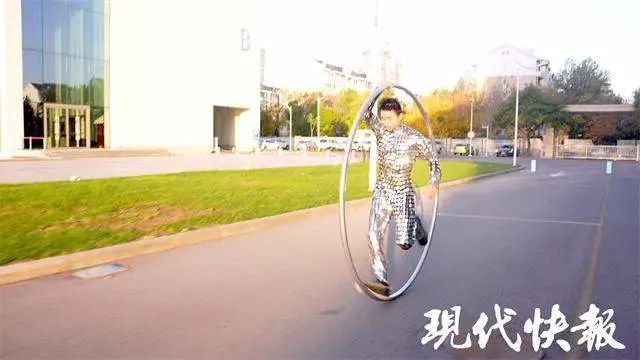 作为盐南文旅的街头艺人,陈元堂在新弄里寒来暑往的表演环上特技,环上行走也是在这期间偶然练成的。" 干我们这行,每天都要训练,其实训练很枯燥,我无意中看到外国人踩着大环走的小视频,不过他跑两三步就失衡了,我突然就想试试。" 陈元堂练习了约一个月,就可以踩着跑," 我现在不限时最长可以跑一公里,正常发挥 100 米。"