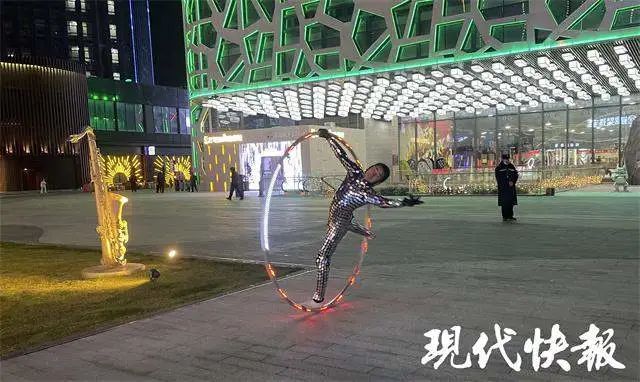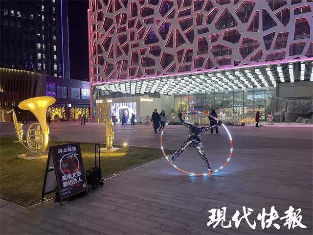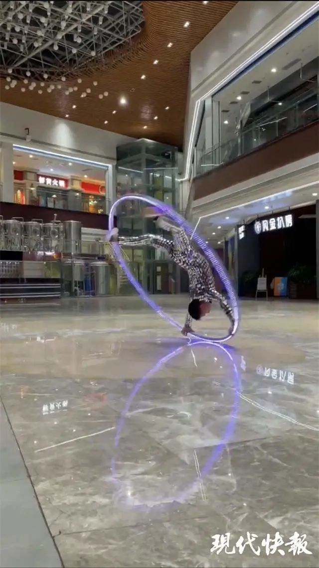 1 月 21 日晚,记者来到新弄里的广场陈元堂表演区域。6 点 45 分,陈元堂脱下外套露出科技感十足的表演服装,哈了一口气,拿起大环开始表演。一个人,一个大环,陈元堂双手、双脚贴在与人同高的环上,以脊椎为中轴,利用离心力,不断变换着角度和姿势,配合酷炫光效,宛如 " 太空飞人 "。