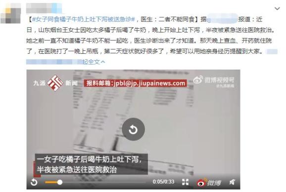 近日,女子同食橘子牛奶上吐下泻被送急诊的新闻引起热议。