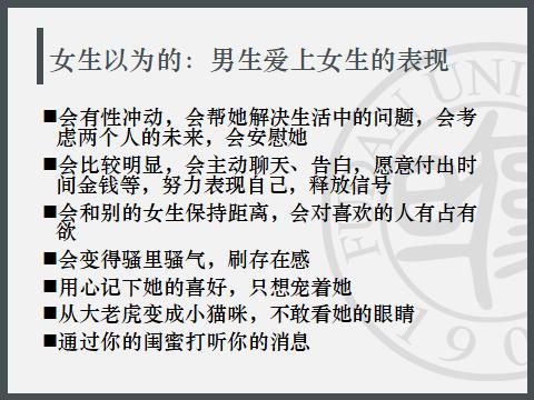 当我们在批评男生的同时,也来看看看女生以为的男生爱上女生的表现: