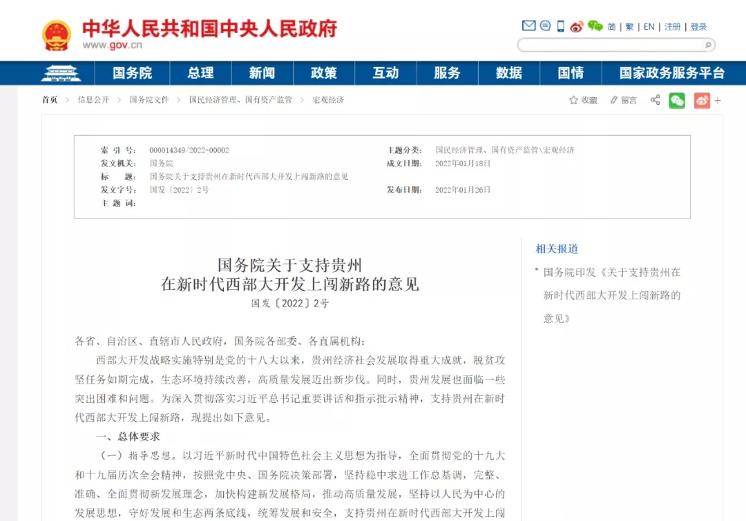 1月26日,国务院印发《关于支持贵州在新时代西部大开发上闯新路的意见》(以下简称《意见》),明确了贵州西部大开发综合改革示范区、巩固拓展脱贫攻坚成果样板区、内陆开放型经济新高地、数字经济发展创新区、生态文明建设先行区等战略定位。