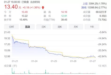 随后,富祥药业股价一路大跌,在1月20日-26日的5个交易日里,该股股价暴跌46.04%。1月27日富祥药业股价报收13.4元/股,与20日最高价相比跌落54.42%,遭遇腰斩。