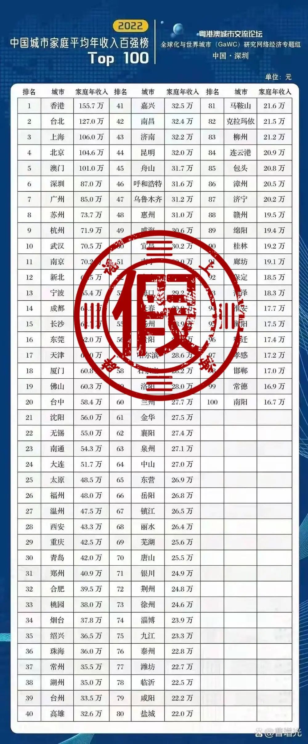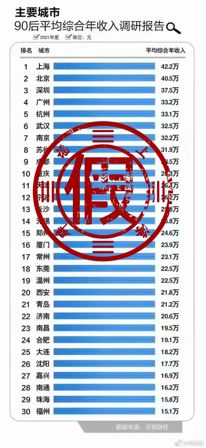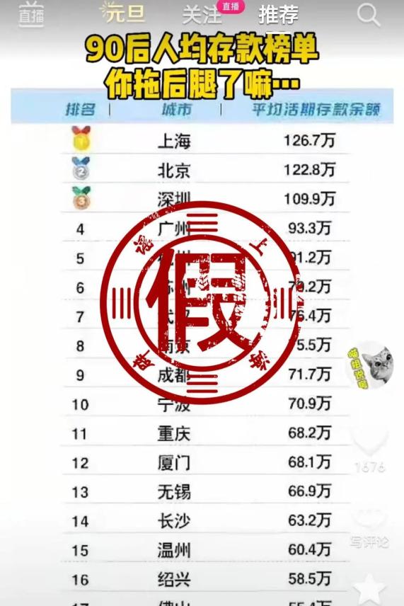 据上海网络辟谣消息,临近年关,一些以“家庭年收入”“个人存款”为主题的榜单又在网络上流传起来,给出的数据让人意外——