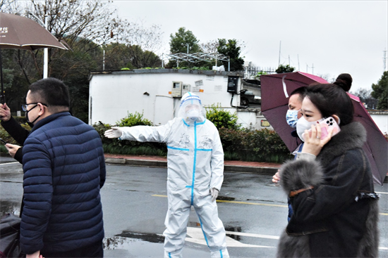 冬日杭城的清晨,伴随着淅淅沥沥的小雨,外加人员不停来回走动,她的防护面罩上弥漫着浓浓的水汽,早就分不清是雨还是热气,模糊了她的面容。虽然看不清她的脸,但她温和而坚定的声音感染了现场排队的人群——时不时有市民会热情地对她的引导服务说“谢谢!”“辛苦你们了!”