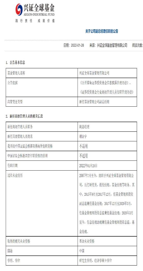 1月28日上午,兴证全球基金官网发布公告,顶流基金经理谢治宇新任公司副总经理,任职日期为2022年1月28日。