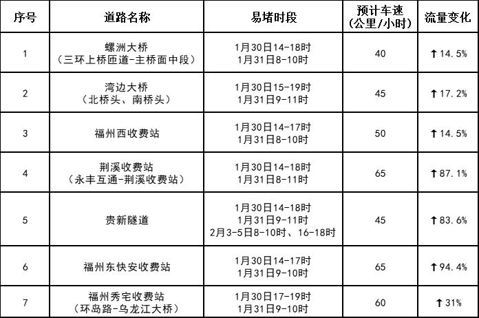 北三环辅道火车站路段1月30日7-9时、16-18时、31日7-10时较易发生拥堵现象,前往火车站二层落客平台的车辆排队到三环路站西路口影响路口正常通行秩序时,辖区大队将对路口进行临时交通管制,由东往西的车辆需继续向前行驶,经过三环辅道罗汉山隧道后掉头绕行,前往火车站的市民请提前合理安排出行方式,充分预留时间,尽量选择搭乘地铁一号线前往。杨桥路因地铁4号线施工较易发生拥堵,前往三坊七巷、东街口东百的市民,可选择经八一七路前往或者搭乘地铁由东街口站出站后步行前往;前往宝龙、万象广场的市民,可选择经工业路前或者搭乘地铁2号线由宁化站出站后步行前往,以避开较为拥堵的西二环路;节假日9-11时森林公园上山路段较为拥堵时,上山车辆可能排队较长,当影响到路口正常通行时,福飞北路审知路口可能进行交通管制禁止东往北右转,易堵时间上山的市民可选择经福飞北路上山;前往烟台山公园的市民,可从六一路或上三路绕行,或者搭乘地铁1号线由上滕站出站后步行前往,以避开因道路施工而易发生拥堵的仓前路。