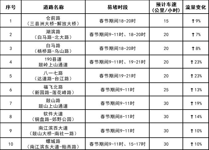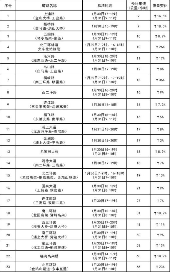 春节期间进出城通道及城区主次干道拥堵时段预计为1月30日下午,1月31日上午,景区周边道路主要拥堵时段为节日期间8-11时、17-21时。其中,1月30日下午出城高峰叠加下班高峰,城区进出城通道以及主次干道拥堵程度将大幅提高,同时拥堵时间将持续较长。