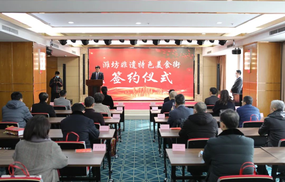1月28日上午,潍坊非遗特色美食街项目签约仪式在世博大厦A座四楼会议中心举行。