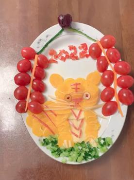 随后,小朋友和家长再将小番茄丁拼出2022字样,用小番茄、胡萝卜、黄瓜和车厘子拼成两个鞭炮,一道老虎迎新春水果拼盘就制作完成了。