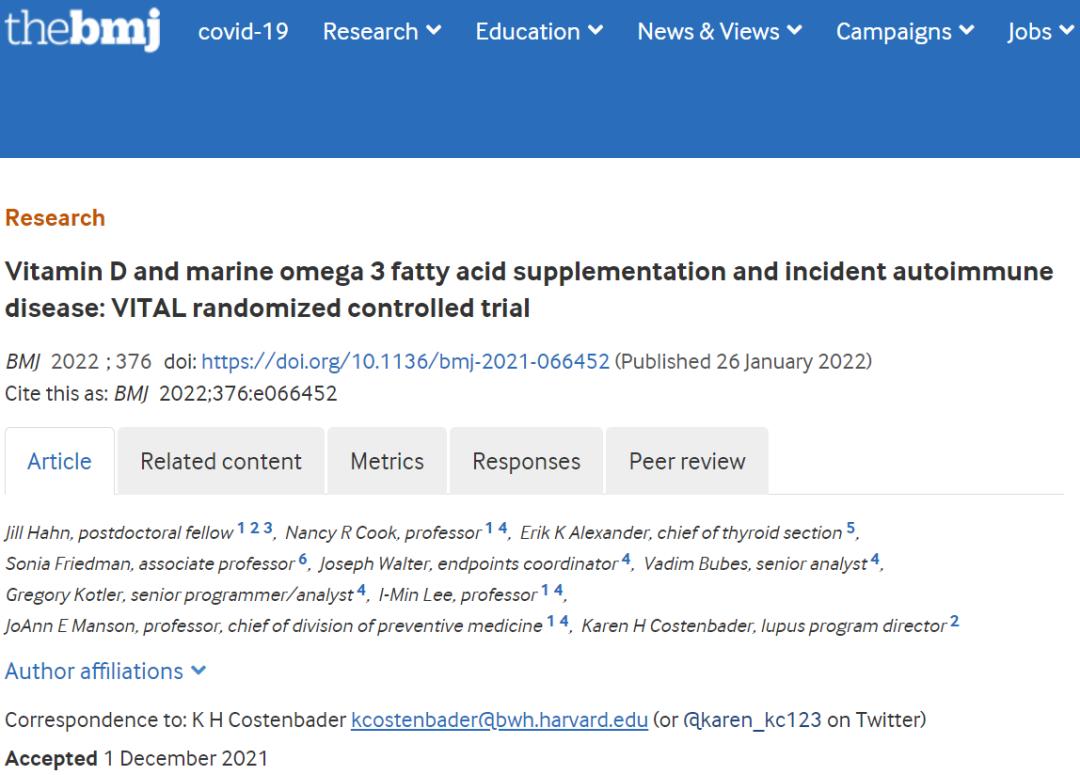 在最近的《英国医学杂志》上,一项在2.5万多名参与者中进行的随机双盲安慰剂对照试验的结果显示,无论是否添加omega-3脂肪酸,服用维生素D都能够使自身免疫疾病的风险下降22%[2]。