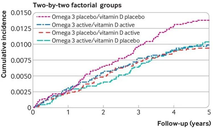 试验设计为2x2形式,分为两大组和四小组,两大组为维生素D组和安慰剂组,维生素D组细分为“维生素D3+鱼油”“维生素D3+模拟鱼油的安慰剂”两小组,安慰剂组细分为“模拟维生素D的安慰剂+鱼油”“模拟维生素D的安慰剂+模拟鱼油的安慰剂”两小组。维生素D的剂量为2000 IU/天,omega-3脂肪酸为1g/天,试验的中位随访时间为5.3年。