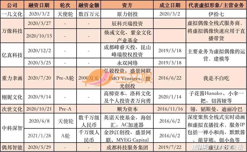 2021年9月,专注于3D原创动画和虚拟演员设计与运营的综合IP公司,虚拟影业获得由峰瑞资本领投的超千万Pre-A轮融资。融资将主要用于虚拟明星的打造和包括抖音、小红书等新媒体运营等方面。