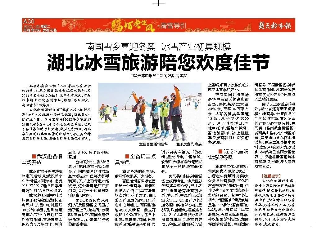 湖北省文化和旅游厅相关负责人表示,为进一步营造冬奥氛围、引导大众参与冰雪旅游,文化和旅游部发布“筑梦冰雪·相伴冬奥”全国冰雪旅游十条精品线路。其中“冬日烟火·南国雪乡”精品线路是唯一一条“北雪南展”的线路,湖北省宜昌百里荒滑雪场、五峰国际滑雪场、神农架国际滑雪场、龙降坪国际滑雪场、中和国际滑雪场、天燕滑雪场、神农顶冰雪乐园、恩施绿葱坡滑雪度假区等8个冰雪点入选精品线路。