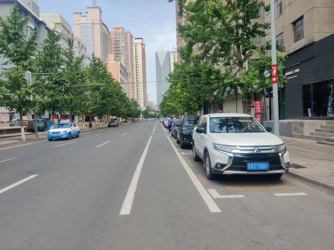 兰州市城区设置在道路上的原收费停车泊位(泊位边框为白色,泊位线侧边印有泊位编号和黄色“兰州泊车”字样)。