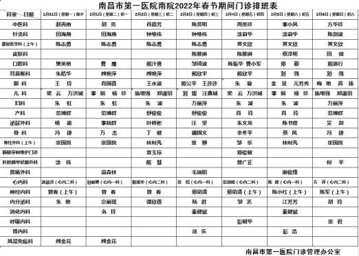 2022年春节假期门诊值班安排:南院区、北院区急诊、发热门诊24小时开诊。