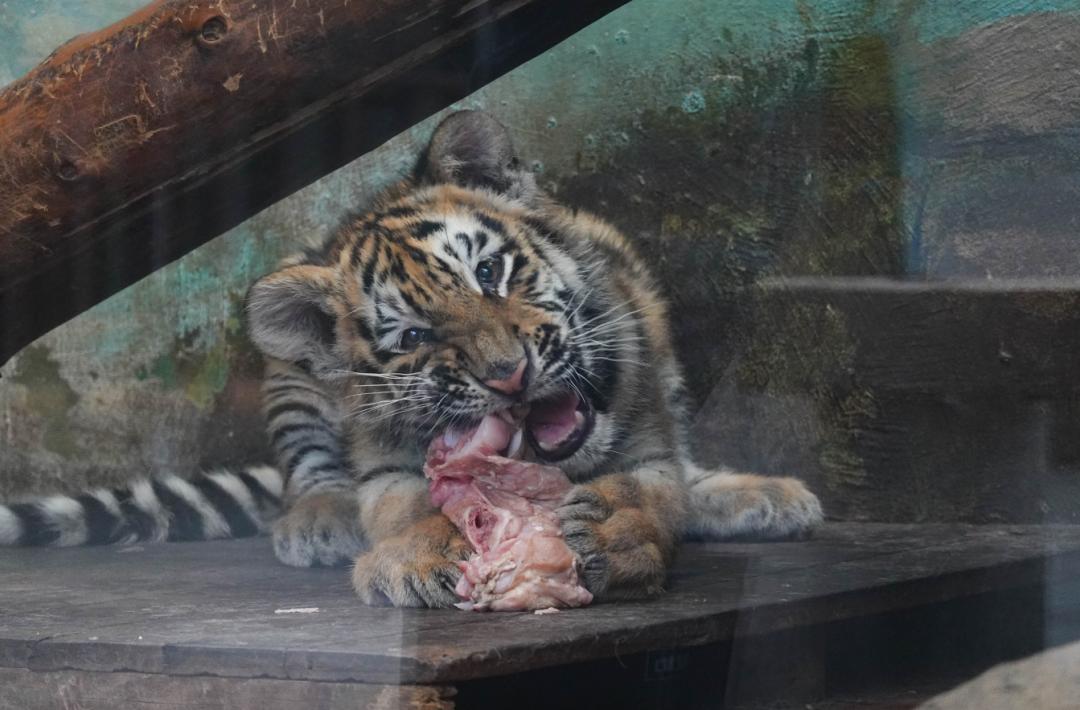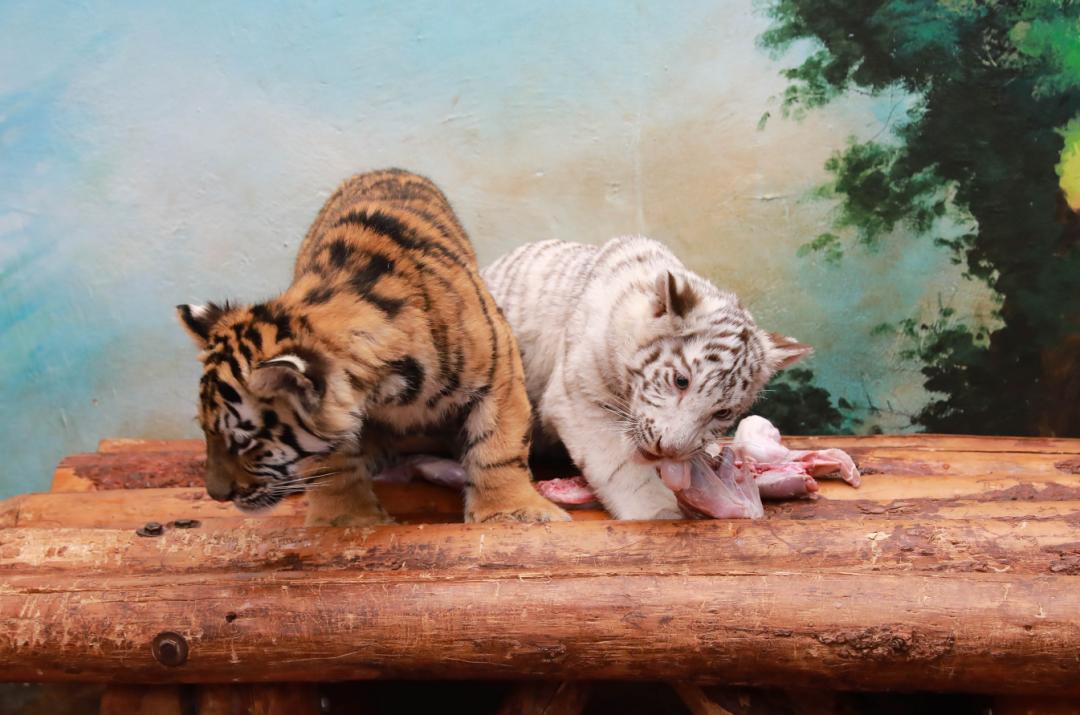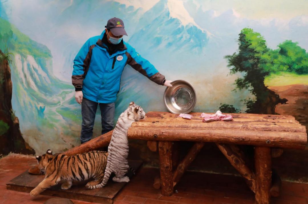 小动物乐园里,4月龄大的东北虎龙凤胎和白虎宝宝的展厅旁游客络绎不绝,玻璃隔开的小房间内,三只小虎正跳来跳去等着保育员送来出生后的第一餐肉食。
