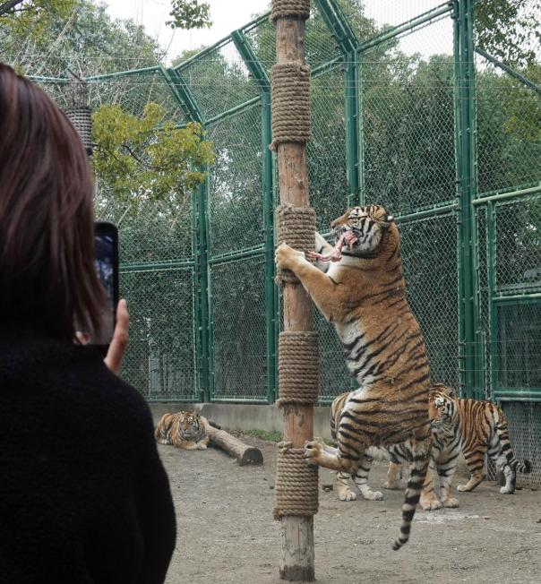 目前上海野生动物园里共饲养着东北虎与白虎两种虎,有4月龄处于幼儿期的萌虎、也有正处青年期的“活泼好动”虎,成年虎们则是一副威风凛凛的猛虎模样,据动物保育员介绍,老虎是怕热不怕冷的动物,到了冬季越是好动。