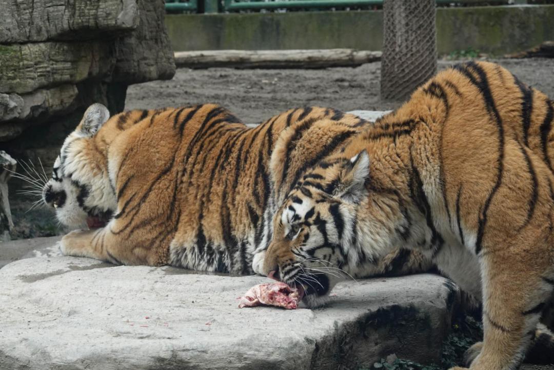 而就在最近,恰逢农历小年,上海野生动物园也特意给它们整备了牛仔骨和鸡腿拼盘,这是三只小虎仔“哇哇落地”后第一次开吃带骨的食物,也叫“开食”,寓意三只小家伙在2022年健康成长、虎虎生威。