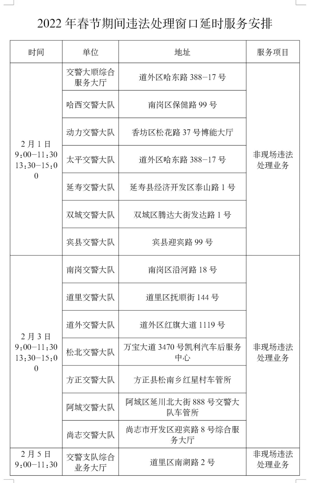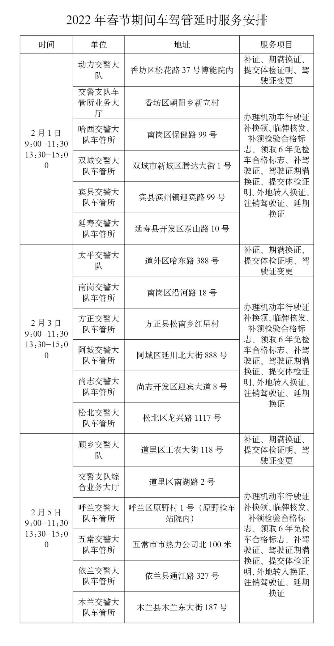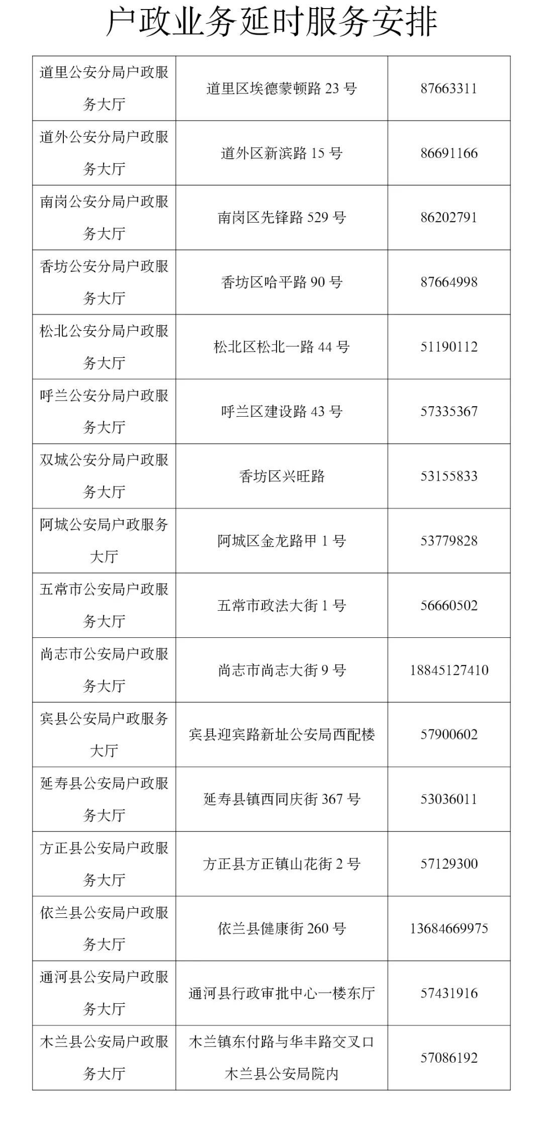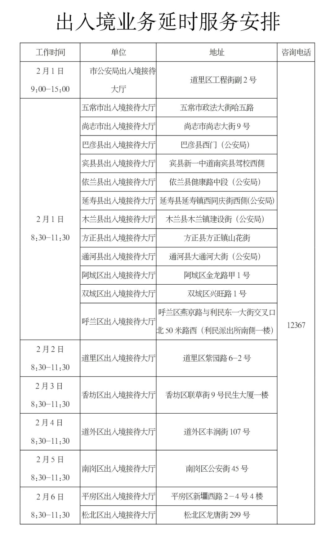 温馨提示:哈尔滨市公安局各区、县(市)公安局户政大厅及各辖区户籍派出所户政窗口,在深化“七办”服务举措基础上,定于2月4日8:30至11:30对外办公。