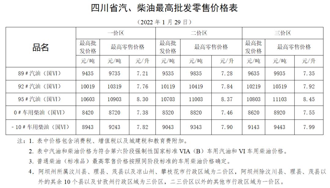 从省发改委官网获悉,国家发展改革委调整并公布了中心城市汽、柴油(标准品)最高零售价格,我省三个价区汽、柴油最高零售价格相应调整。以成都为例,92号汽油上涨为7.76元/升。调整后的价格自2022年1月29日24时起执行。具体油价如下: