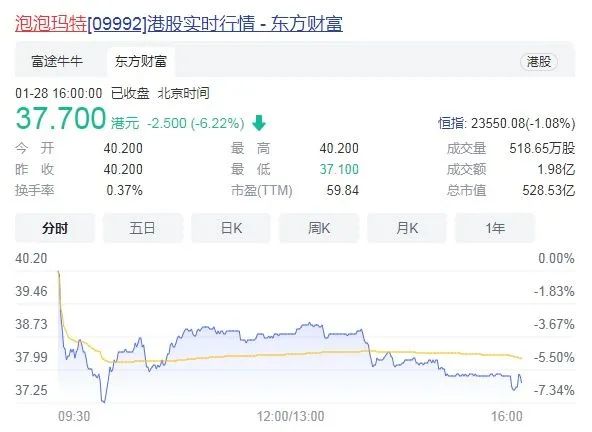 1月28日,泡泡玛特(证券代码:09992)开盘后持续走跌,截至收盘跌超6%,报37.70港元/股,已跌破发行价38.5港元/股,创上市以来收盘新低。