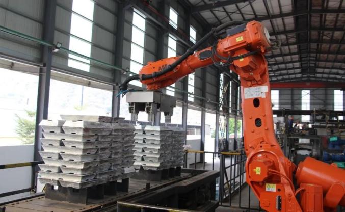 全自动流水线旁机器人在精准抓取、堆码金属锭块 图片来自红河日报资料库