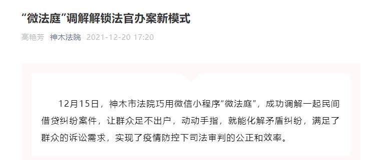 引入陕北首个“无人律所”,群众可随时选择平台上的4万多名律师进行在线视频连线一对一进行咨询;“神木执行”微信公众号全面运行,为当事人提供线上司法服务,不断提高人民群众司法获得感。
