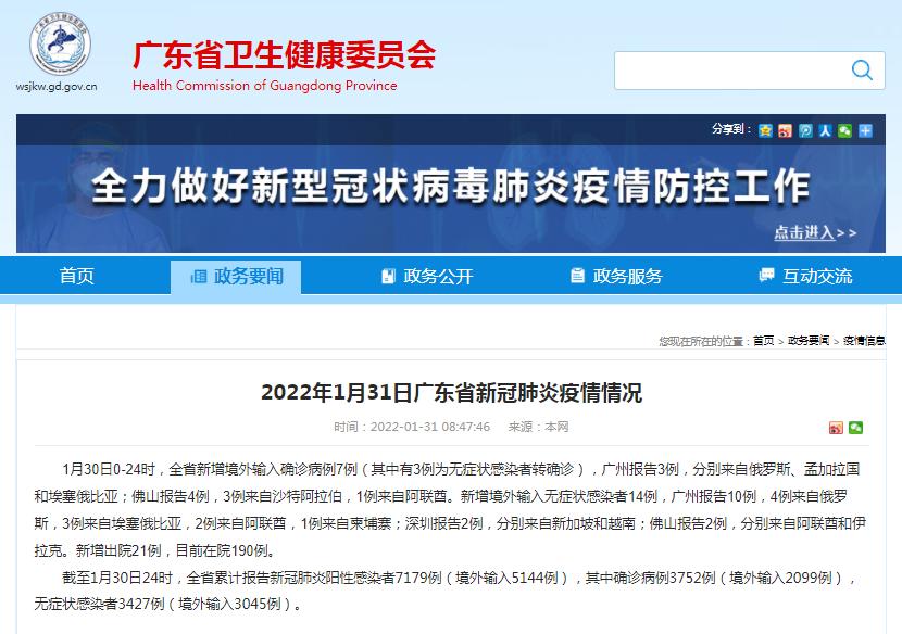 1月30日0-24时,全省新增境外输入确诊病例7例(其中有3例为无症状感染者转确诊),广州报告3例,分别来自俄罗斯、孟加拉国和埃塞俄比亚;佛山报告4例,3例来自沙特阿拉伯,1例来自阿联酋。新增境外输入无症状感染者14例,广州报告10例,4例来自俄罗斯,3例来自埃塞俄比亚,2例来自阿联酋,1例来自柬埔寨;深圳报告2例,分别来自新加坡和越南;佛山报告2例,分别来自阿联酋和伊拉克。新增出院21例,目前在院190例。