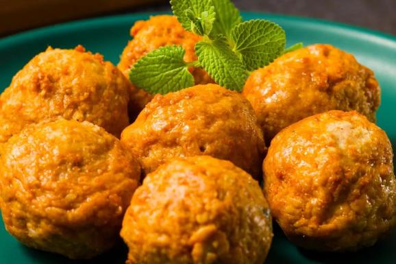 肉圆子、糯米圆子、番薯圆子,加上点点姜蒜,过油炸熟,刚出锅的圆子表皮金黄,外焦里嫩,一口咬下去,回味无穷!
