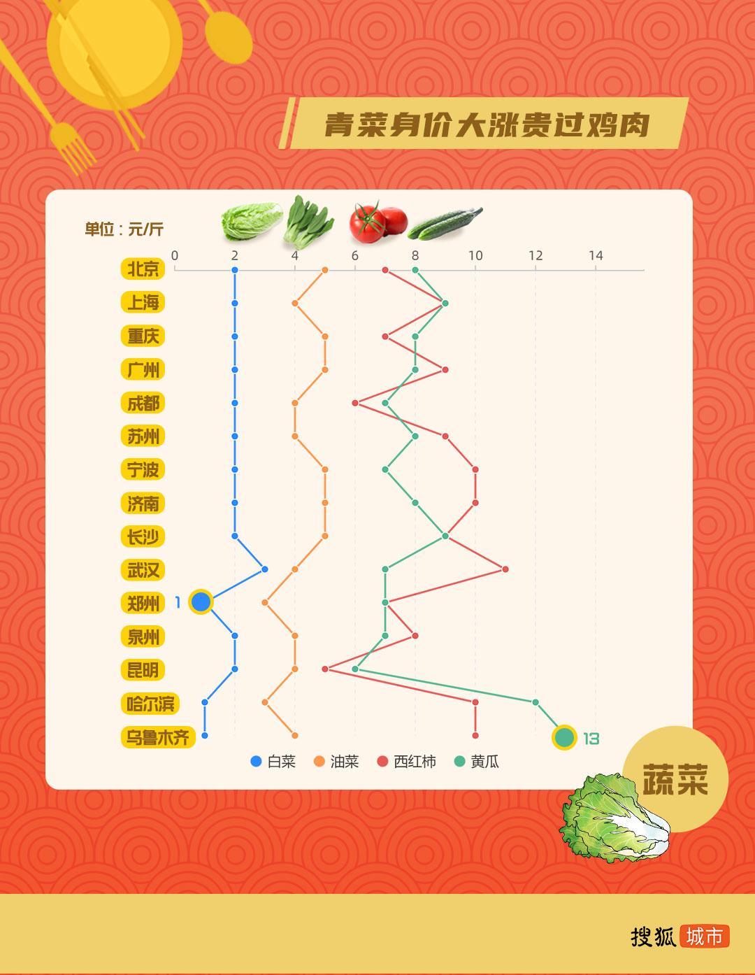不过蔬菜价格上涨明显,部分城市黄瓜、西红柿已接近鸡胸肉价格,价格最平稳亲民的国民蔬菜还是大白菜(2元/斤)。