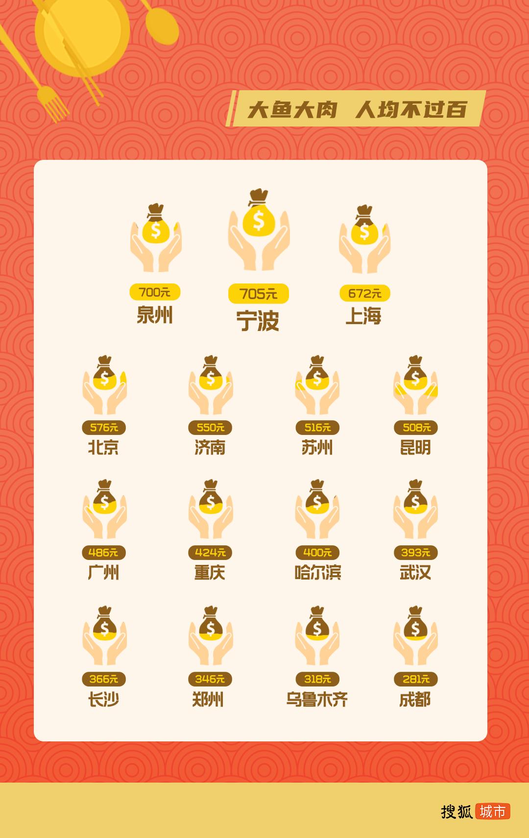 搜狐城市选取其中15个重点城市,整理出一份“15城年夜饭花销图鉴”,敬请各位享用~