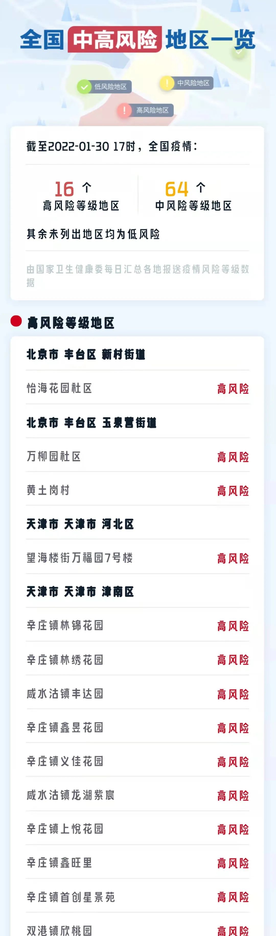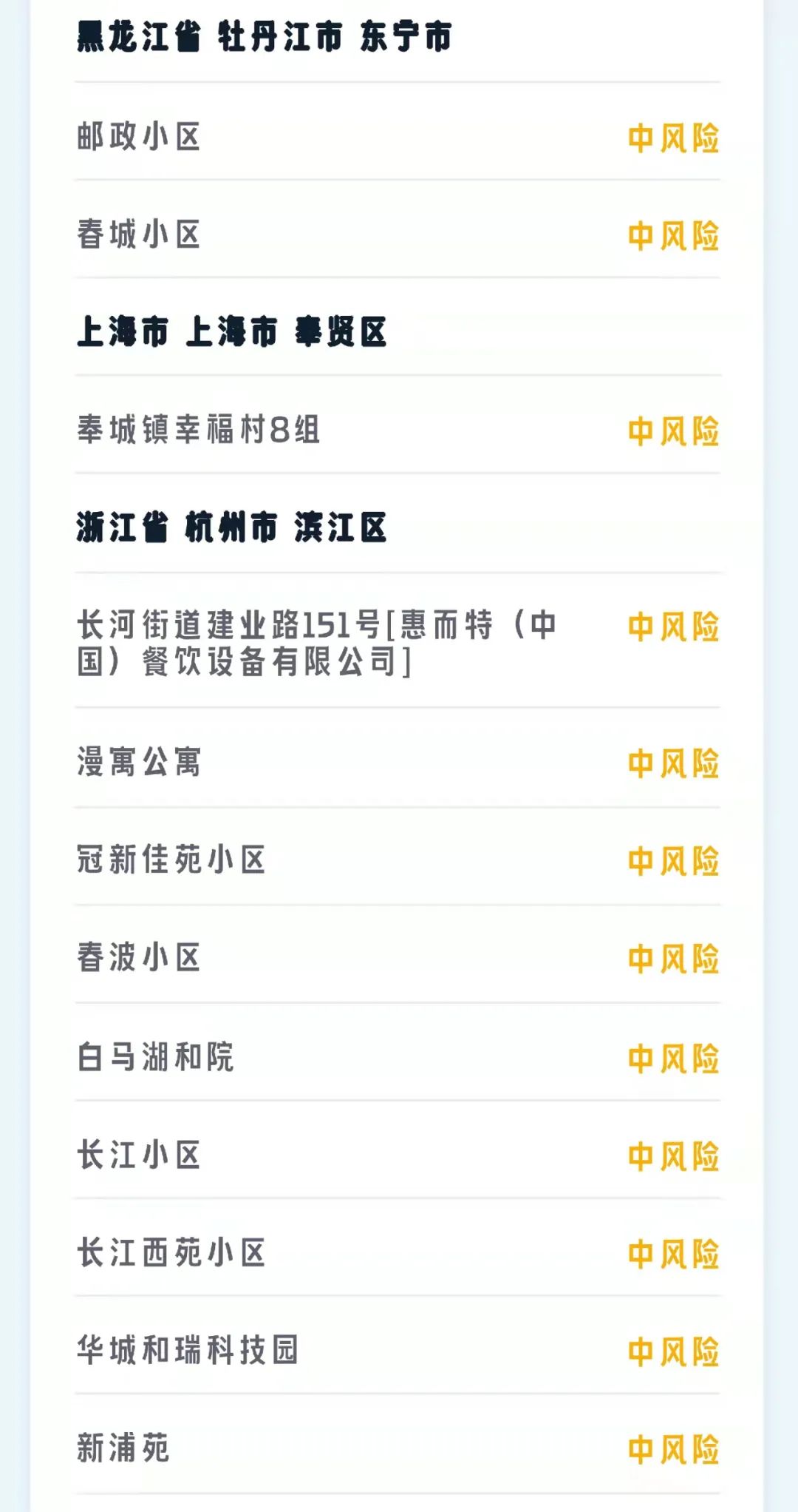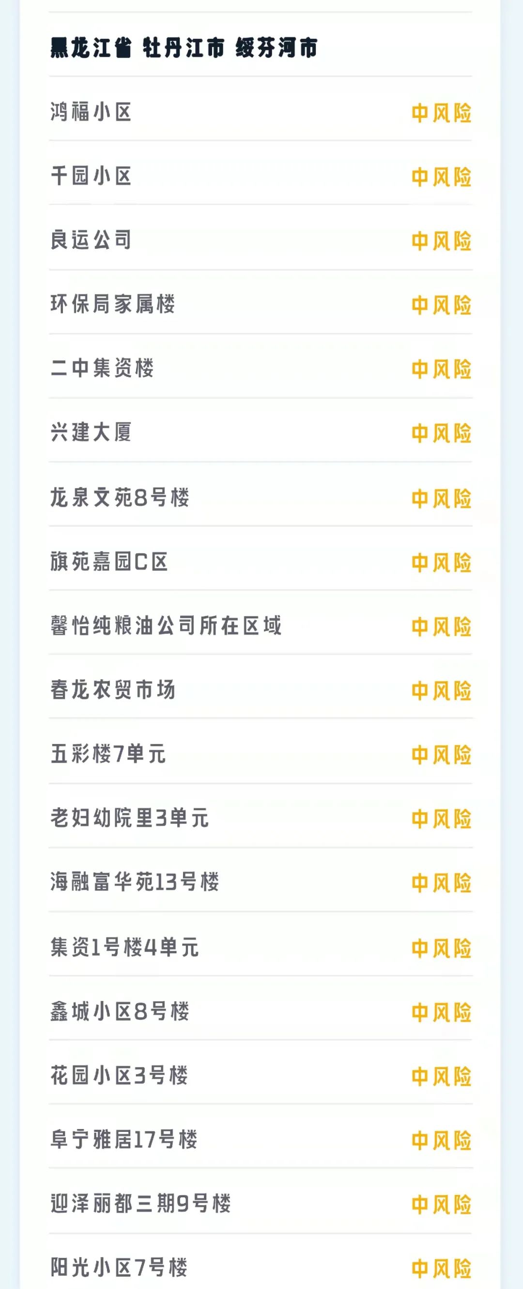 自2022年1月30日0时起,绥芬河市春龙农贸市场、五彩楼7单元、老妇幼院里3单元、海融富华苑13号楼、集资1号楼4单元、鑫城小区8号楼、花园小区3号楼、阜宁雅居17号楼、迎泽丽都三期9号楼、阳光小区7号楼调整为中风险地区。