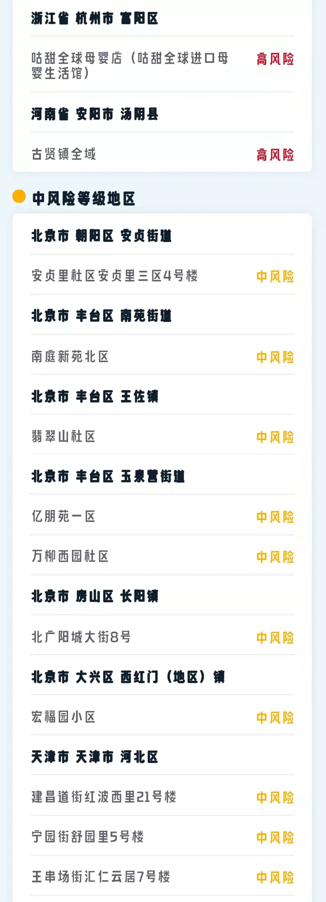 截至目前,北京市有高风险地区1个,为丰台区玉泉营街道万柳园小区;有中风险地区9个,为朝阳区安贞街道安贞里社区安贞里三区4号楼,丰台区新村街道怡海花园恒丰园、南苑街道南庭新苑北区、玉泉营街道亿朋苑一区、玉泉营街道黄土岗村、玉泉营街道万柳西园社区、王佐镇翡翠山社区,房山区长阳镇北广阳城大街8号,大兴区西红门镇宏福园小区。全市其它地区均为低风险地区。